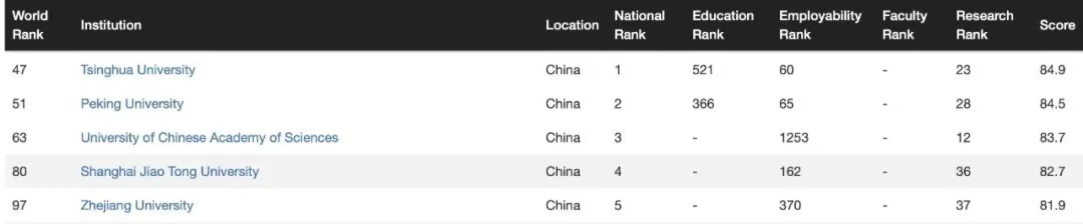 清华、北大、中国科技大、交大、浙大跻进Top100,分别位列第47名、51名、63名、80名和97名,排名较去年均有提升。