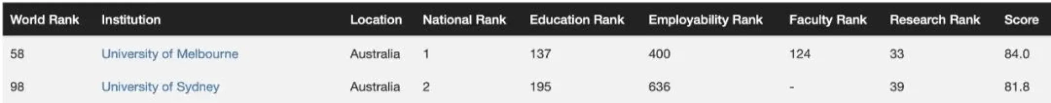 墨尔本大学和悉尼大学进入Top100,分别位列第58名和98名。