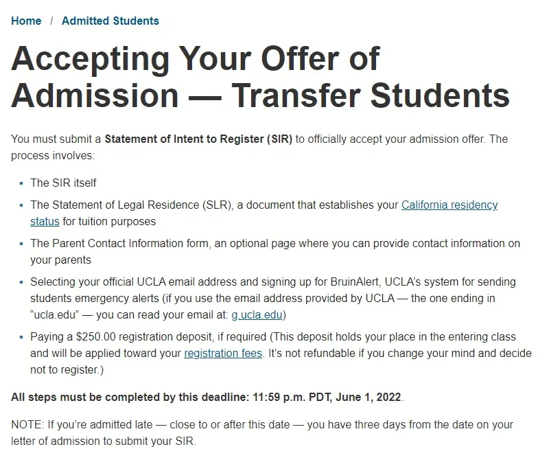 学校邀请后,申请者也需要需要在截止日期前opt in进入候补名单。之后也要仔细阅读不同UC的具体要求,可能会要求提供Spring学期的成绩、文书、补充材料等,或者包含提交文件的重要deadline。