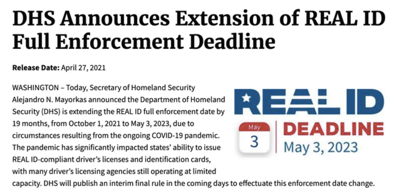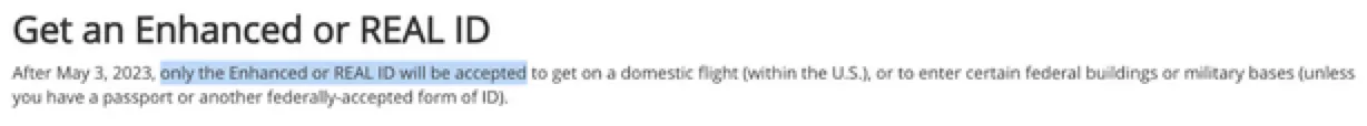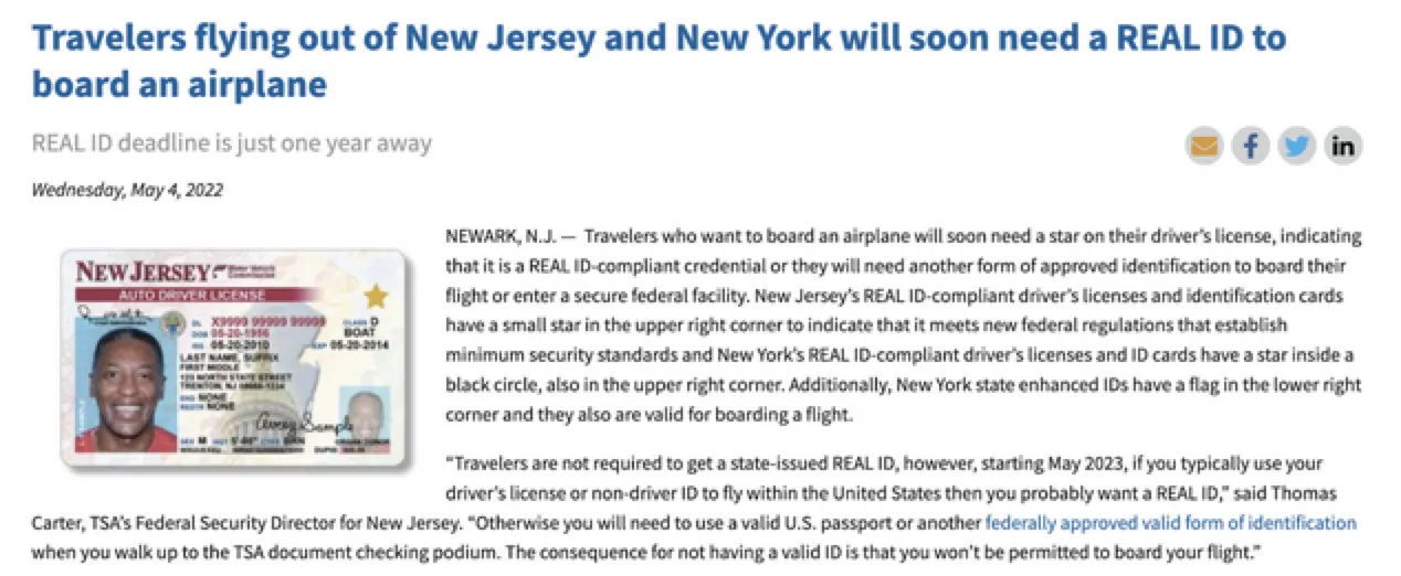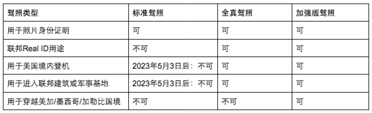 2023年5月3日起,纽约和新泽西人需要持有Real ID或加强版驾照(Enhanced),才能在美国境内乘坐飞机,或进入联邦大楼、军事基地等。