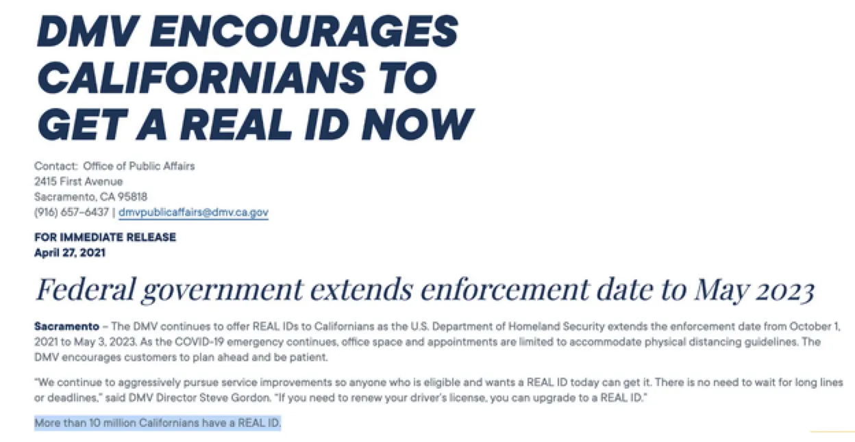 各州的推行速度不同,像加州就属于比较快的。截止至去年4月,已有超过1千万加州居民拥有Real ID。即使疫情之下,加州政府依然全力推进Real ID的全民普及,简化手续,尽量让换Real ID像换驾照一样轻松。