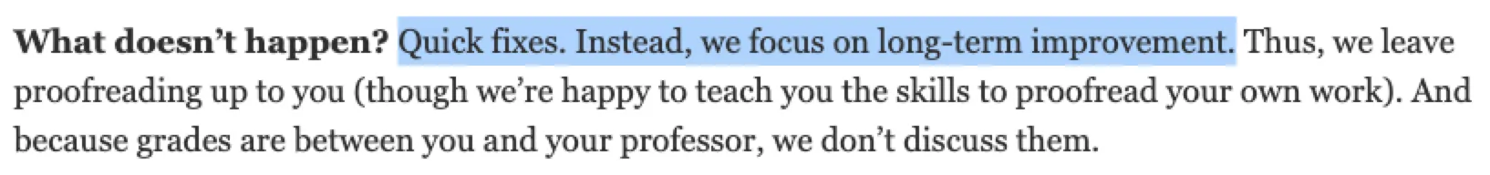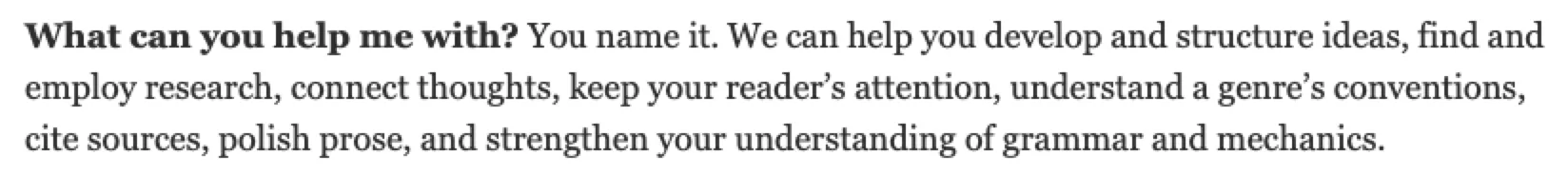 我们可以看到不少大学一直强调自己的writing center不是“改”或“校对”文章,而是提出主观的意见与建议,“帮助”提升作者素养。