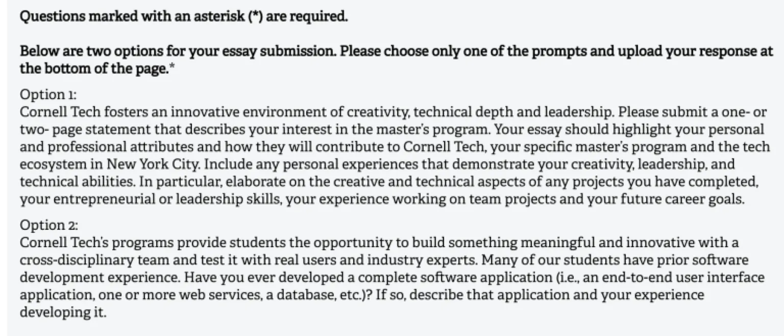 拿Cornell Tech的申研文书举例,我们可以看到他们的文书要求非常细致,从项目/技能/经历/职业规划的说明,具体到一个software development经历阐述,光前期就需要进行严谨的头脑风暴和素材梳理。