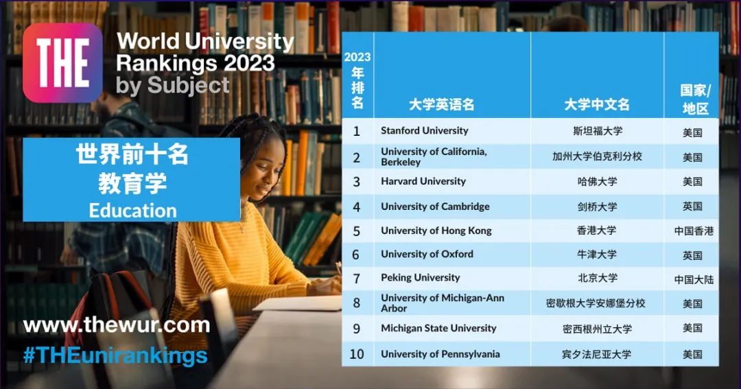 斯坦福大学连续第六年位居教育学学科榜首。加州大学伯克利分校和哈佛大学排名第2和第3名。