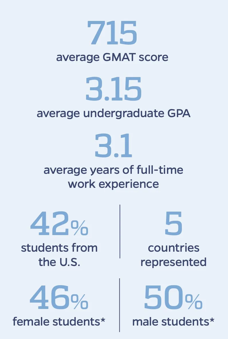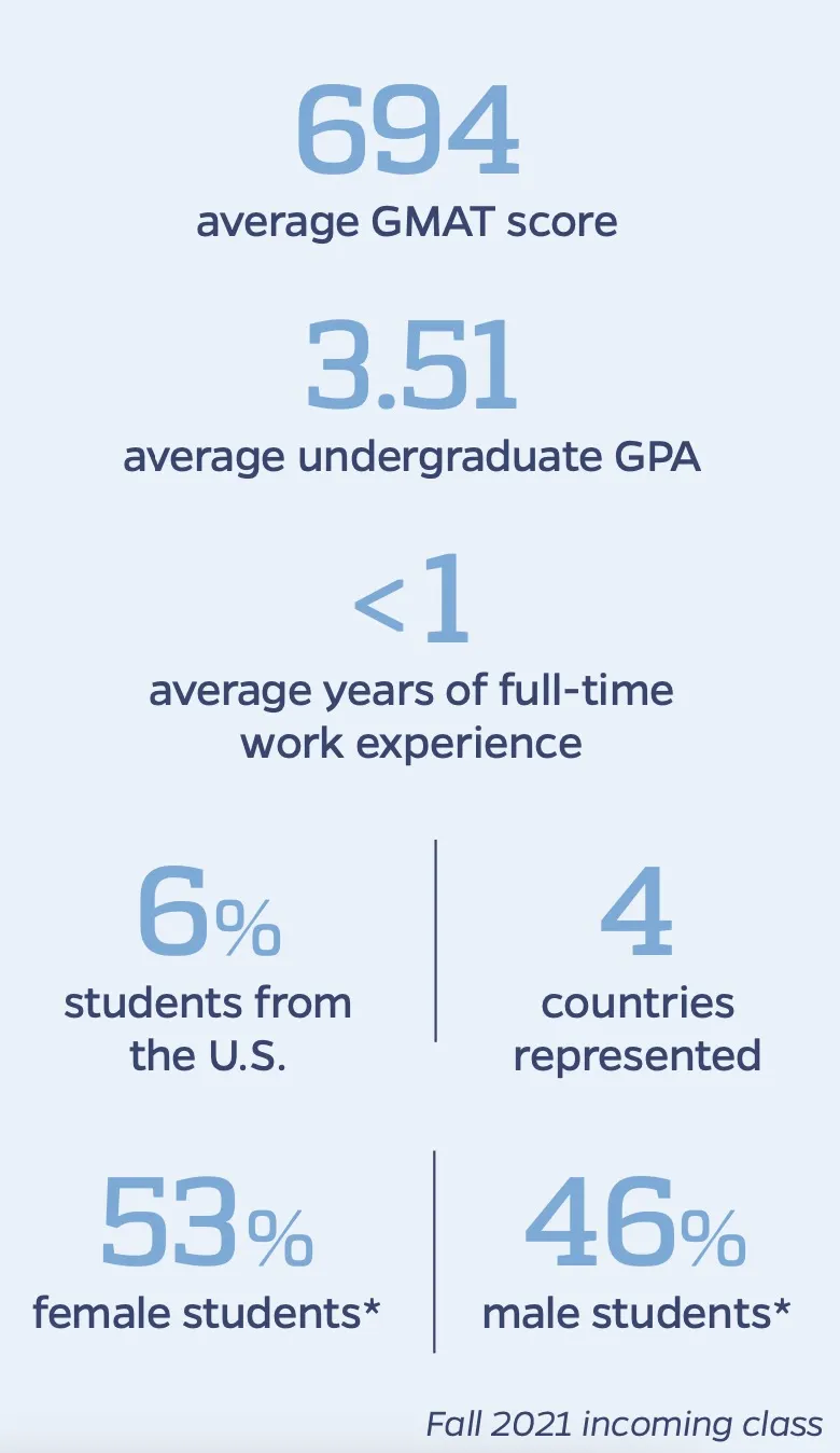 项目录取平均GPA为3.55,GMAT分数在686分左右,大多数学生为国际生且女生比例较大。