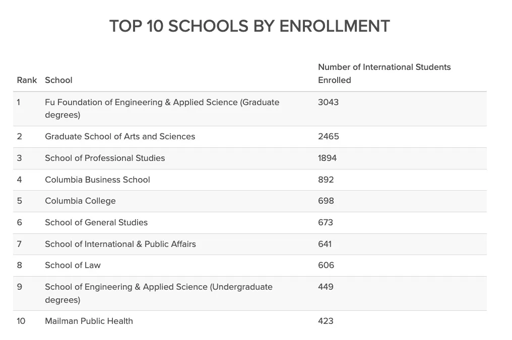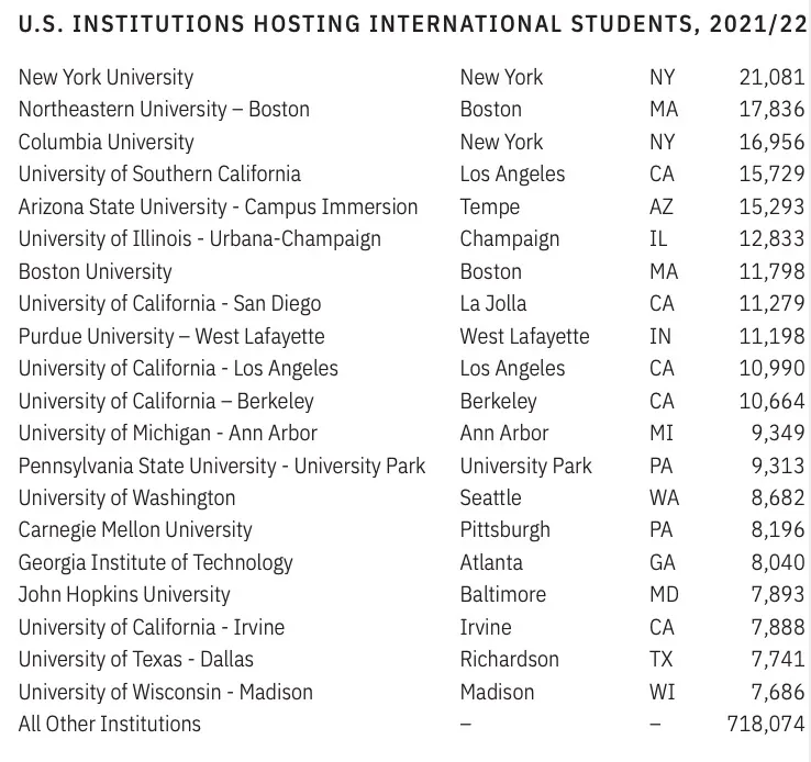 根据《2022美国门户开放报告》指出,哥伦比亚大学是美国招收国际生第三多的大学,仅次于纽约大学和东北大学。