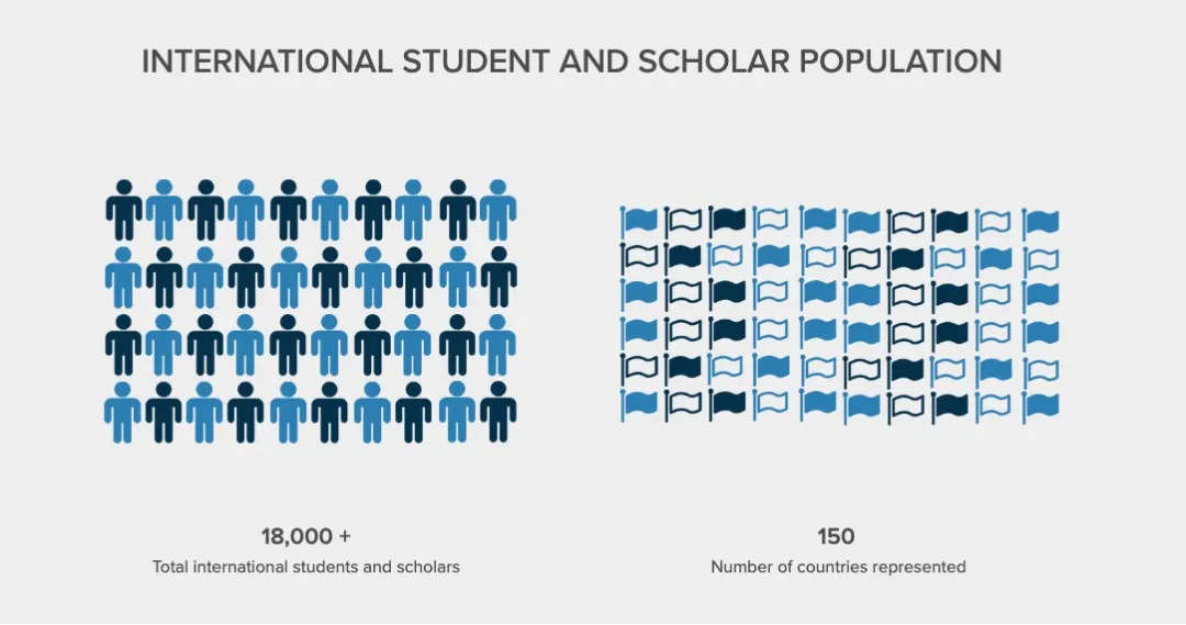 哥大官方数据展示,目前有超过18,000的国际学生和学者,来自全球150个国家和地区。其中留学生最多的国家分别是:中国、印度、加拿大,中国留学生超过8000名。女性学生占比51.25%,男性学生占比48.75%。