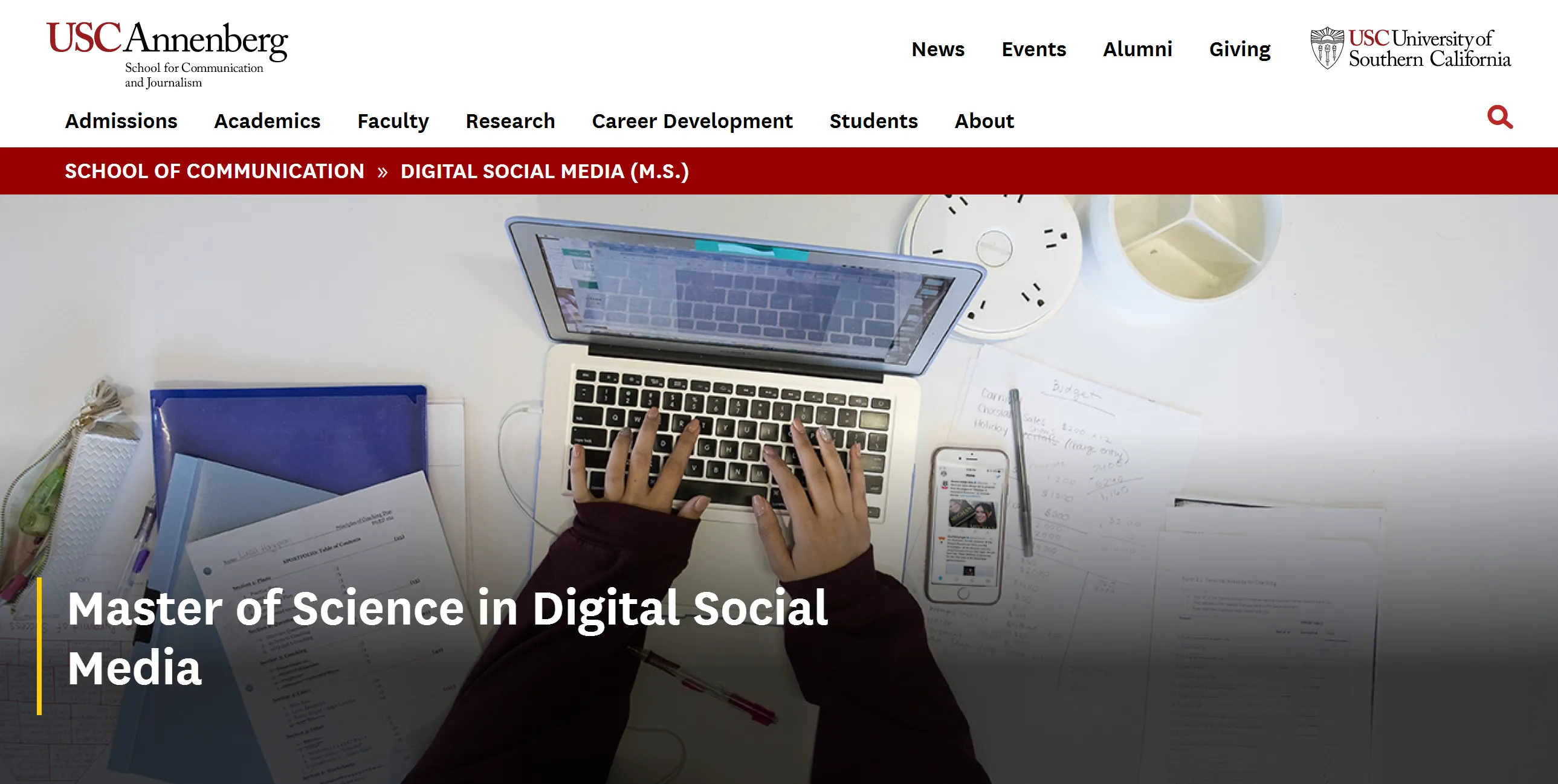 南加州大学 Digital Social Media:在南加州大学数字社交媒体项目中,学生将学习对开展、开发和管理社交媒体平台、数字媒体、应用 程序和在线交流至关重要的理论、技能和战略思维方式。该项目为STEM指定的学位课程。