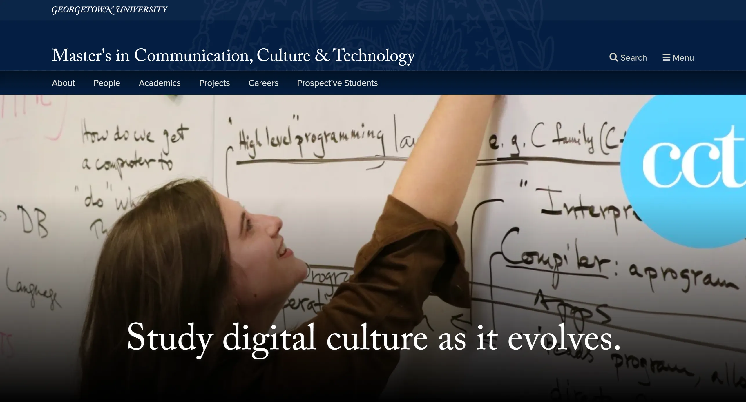 乔治城大学 Communication, Culture & Technology:传播、文化与技术是乔治城的旗舰跨学科艺术硕士项目。其教育重点。在于建立一个允许智力探索的课程。该项目只有2门必修课。选修课可以来自传播、文化和技术课程或校园内的其他课程。