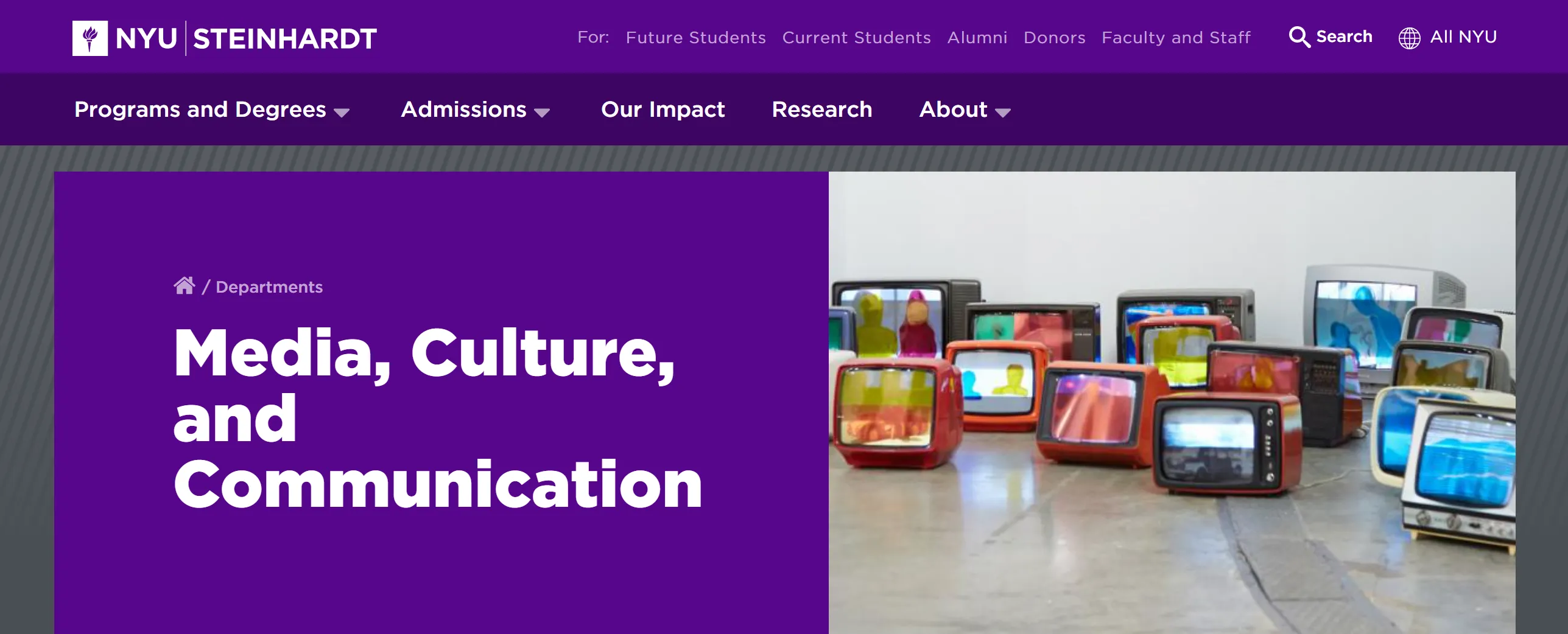 纽约大学 Media, Culture & Communication:该项目培养敏捷研究人员从不同 的角度批判性地思考不断变化的行业、技术和文化。学生将与NYU多元化且著名的媒体研究学院密切合作。该项目的研究和课程突出了全球媒体和文化、数字媒体和新技术、媒体历史和理论、视觉文 化、种族和政治的研究。