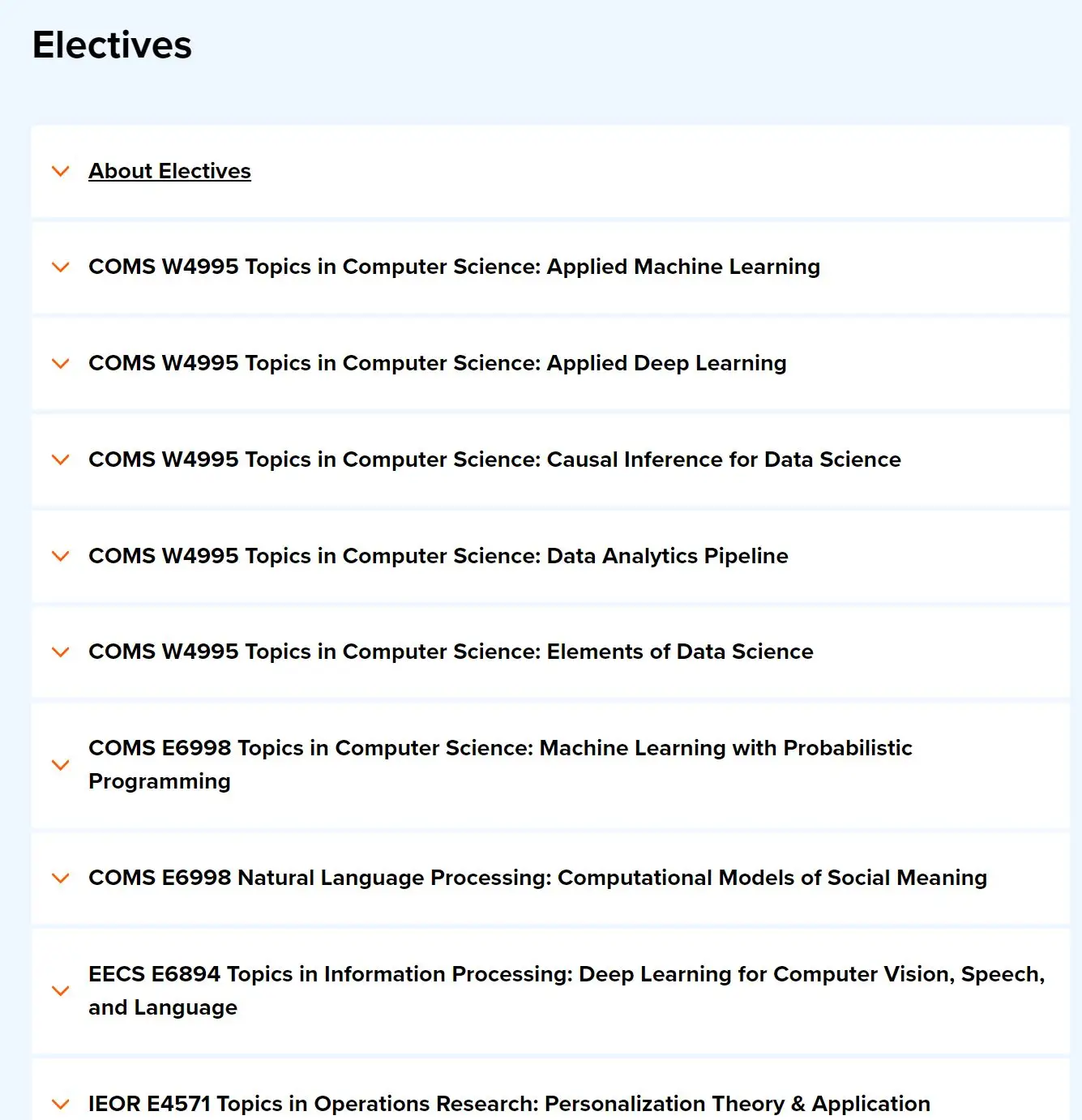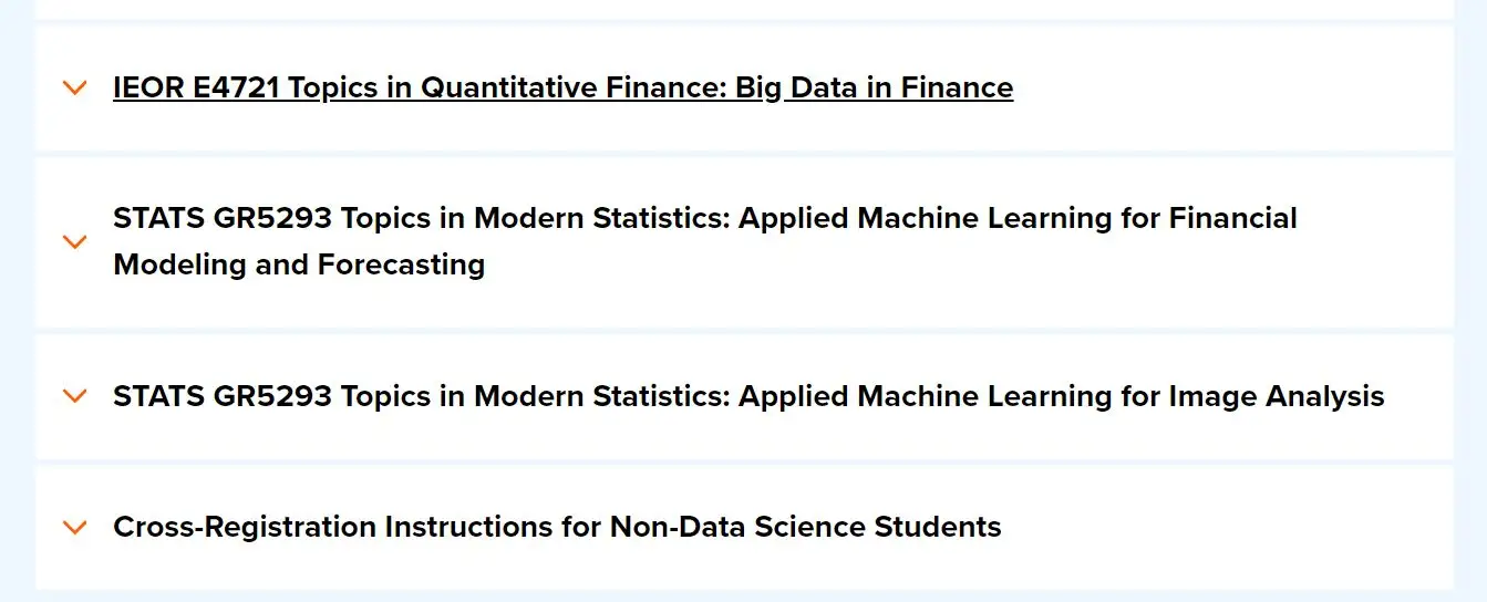 我们从课程设置中可以看到在计算机领域,工程领域,统计领域都是有相关的课程,在选修课中,也是可以看到机器学习,甚至在金融领域的金融大数据和金融建模都是可以学习的。涉及内容非常广泛。