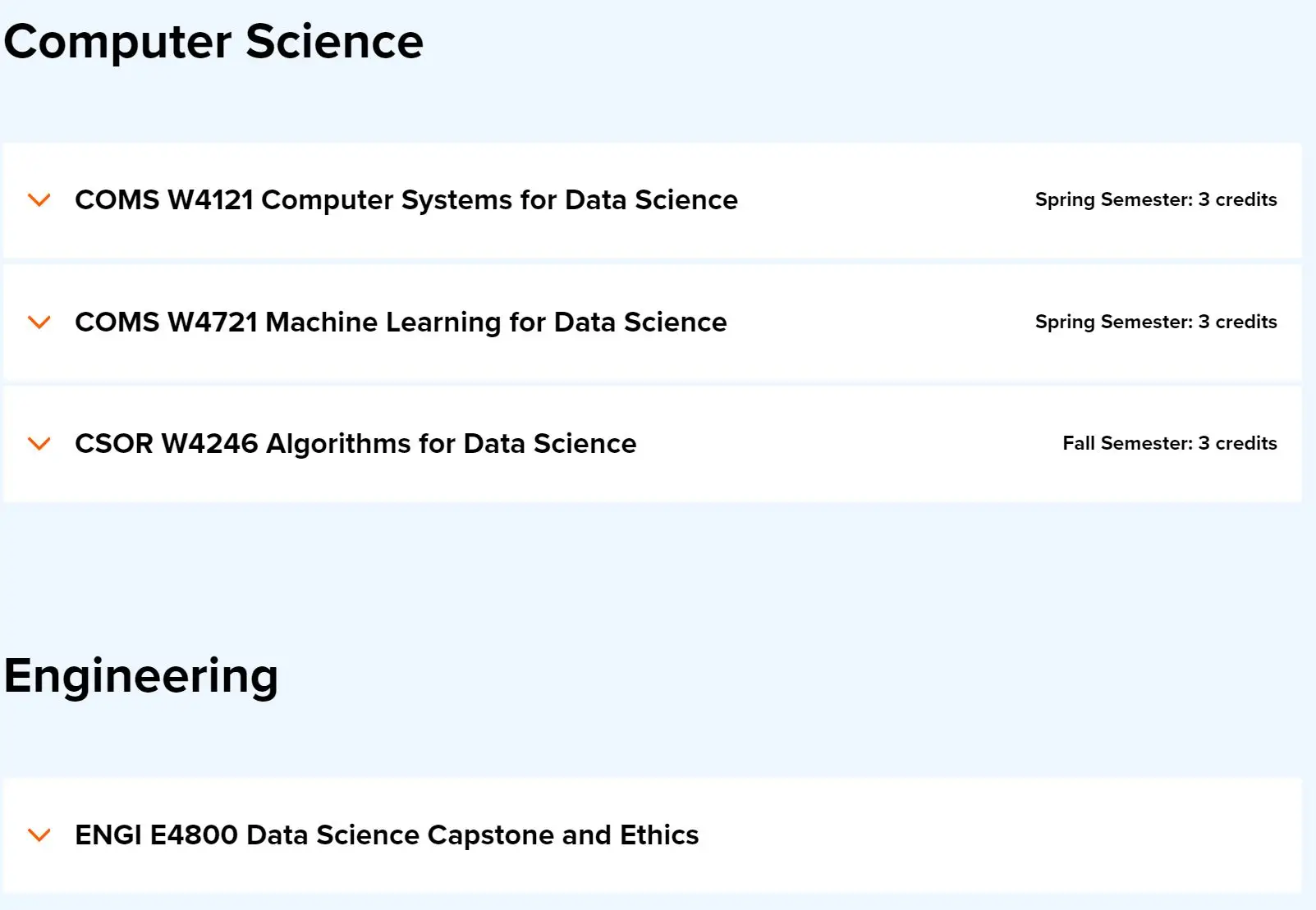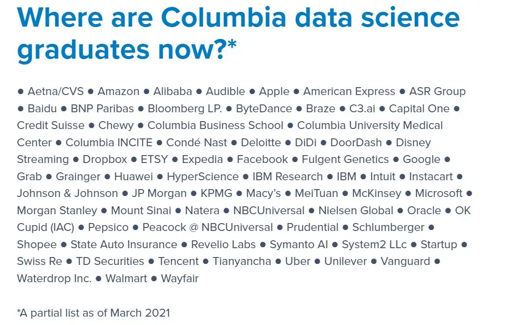 哥伦比亚大学的数据科学学生有机会进行原创研究,制作顶点项目,并与学校的行业合作伙伴和世界一流的教师互动。学生还可以选择专注于创业的选修课或学校中心所涵盖的学科领域。