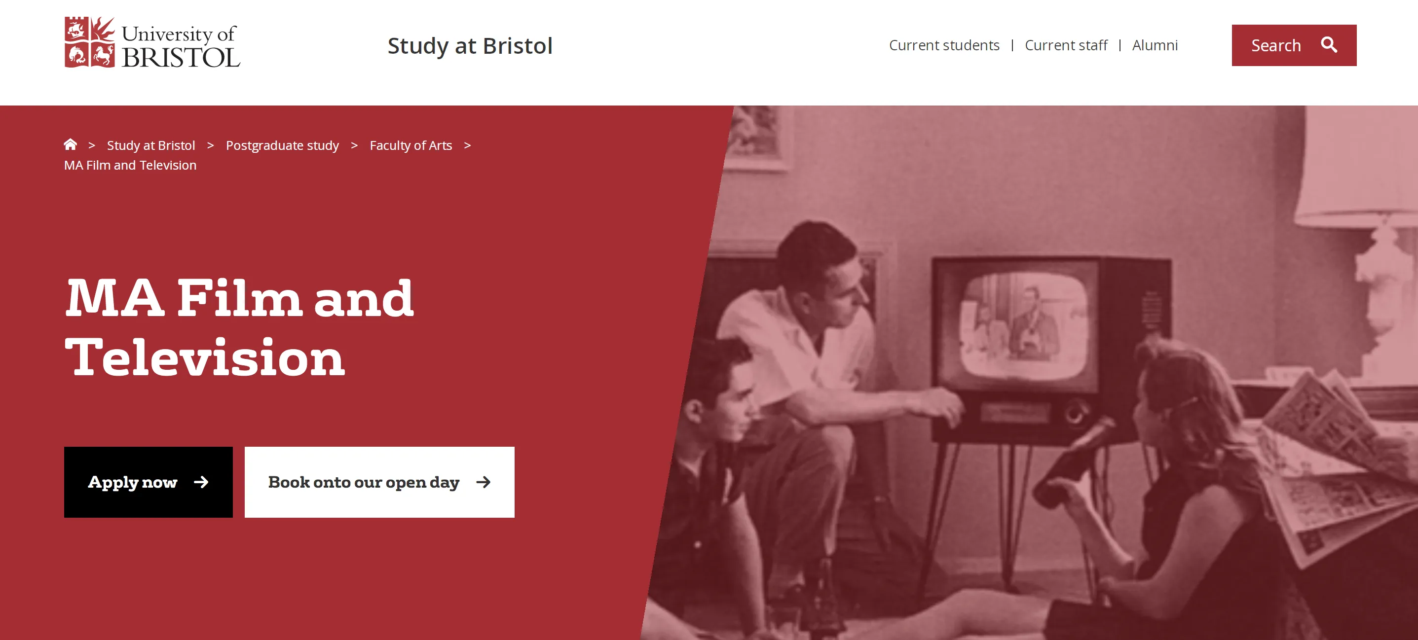 布里斯托尔是学习电影和电视的绝佳城市,拥有各种电影,电视和数字媒体空间,如Arnolfini,BBC Bristol,The Cube和Watershed媒体中心。布里斯托尔的Harbourside是一系列电影节的所在地,包括邂逅短片和动画节,闹剧节和非洲眼节。