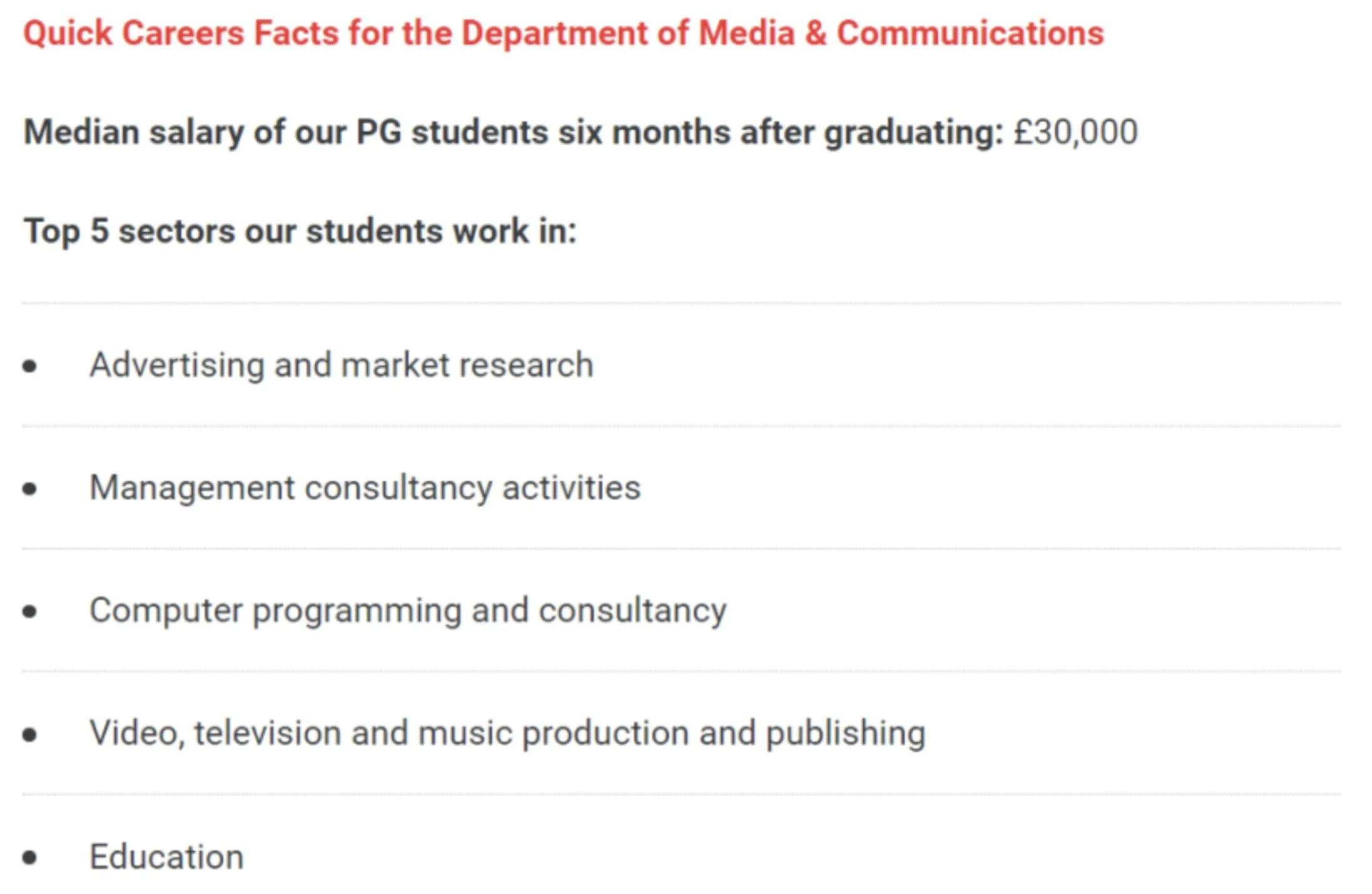 当然除了以上所讲述院校外,英国也有很多传媒强校。现在,越来越多的大学为了全面发展,迎合国际市场需求,会开放更多的传媒课程来给到国际学生。而我国国内的传媒行业正处于高速发展的状态,需要大量的传媒人才。无论是报纸、杂志、电视、网络媒体、或者企业,对于传媒人才也是万分渴求。在文化传播,企业公关,外联等工作岗位上,传媒专业的学生比其他专业都更具优势。所以去英国留学绝对是值得的。
