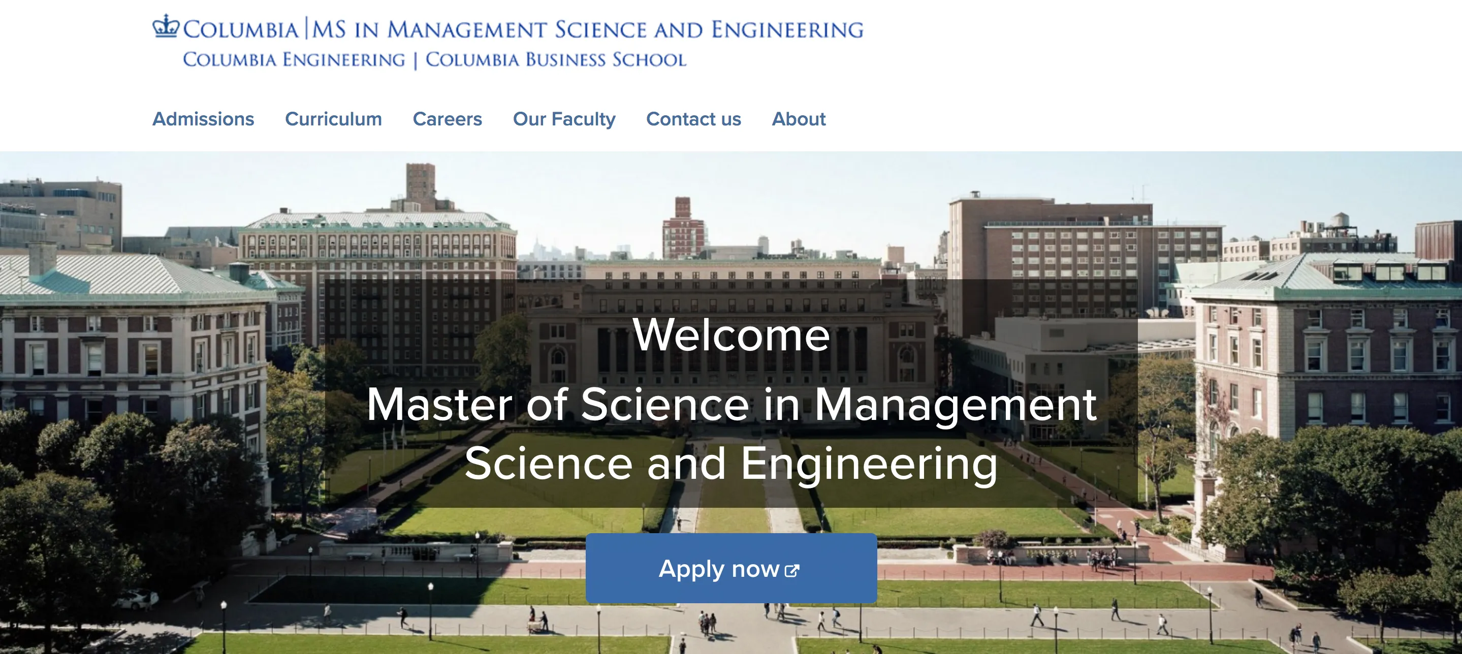 哥伦比亚大学管理科学与工程专业(Management Science and Engineering)是开设在IEOR部门下以Engineering School与Business School合办的项目,属于STEM范畴。相比IEOR旗下的其他专业,MS&E会有更多优先的商学院的资源。这点与同时IEOR下的MSBA项目类似,但是MS&E的创办历史其实要长很多。整体来说,这个项目注重培养未来结合管理与技术/工程的行业领袖。