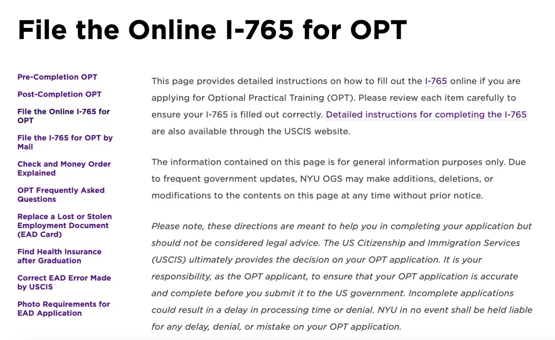 拿NYU来举例,先在搜索引擎查询如 "NYU OPT Application" ,然后进入学校的官方指导页面: