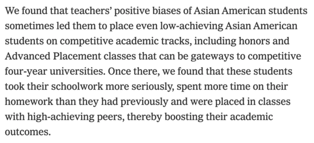 Lee老师认为:亚裔学生正是受益于种族的“刻板印象”,老师普遍认为亚裔学生更聪明、勤奋、有成就,甚至让那些资质平庸的亚裔学生也从中获益,得到更高的分数。