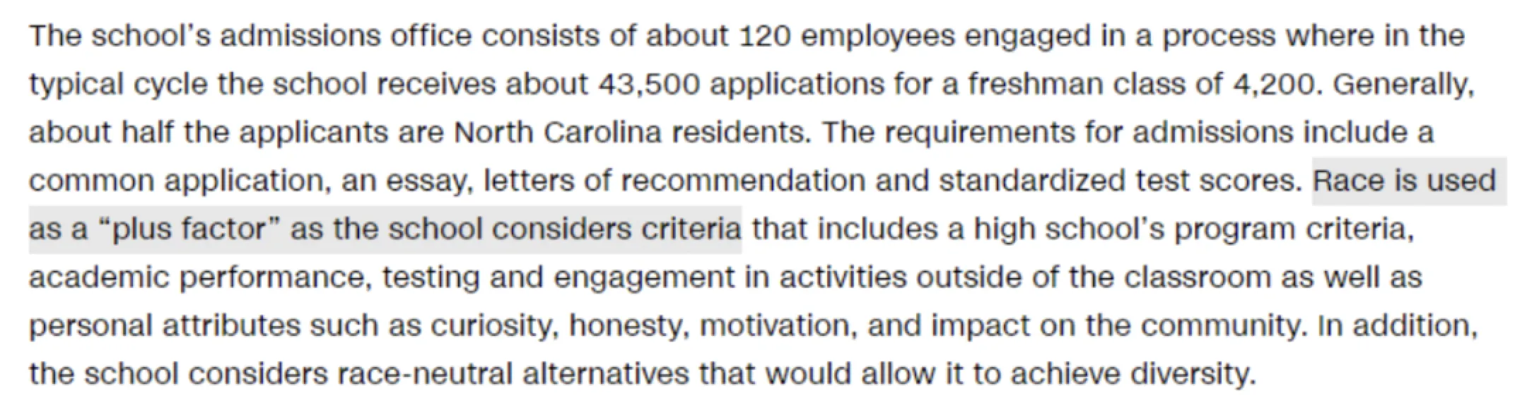 根据Ballotpedia的数据,大约20%的公立大学在招生过程中仍然考虑种族因素。包括哈佛和北卡罗来纳大学在内的多所高校表示,将“种族”作为对申请人进行整体评估的因素之一,是推进学校多元化的必要手段。UNC甚至将“种族”作为招生中的申请加分项: