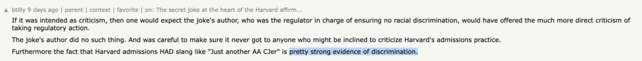 而对于立志学医的亚裔申请人,哈佛招生官给出的备忘词是:“又一个AA CJer”。这已经是赤裸裸的歧视了,意思就是亚裔学生功利呗。