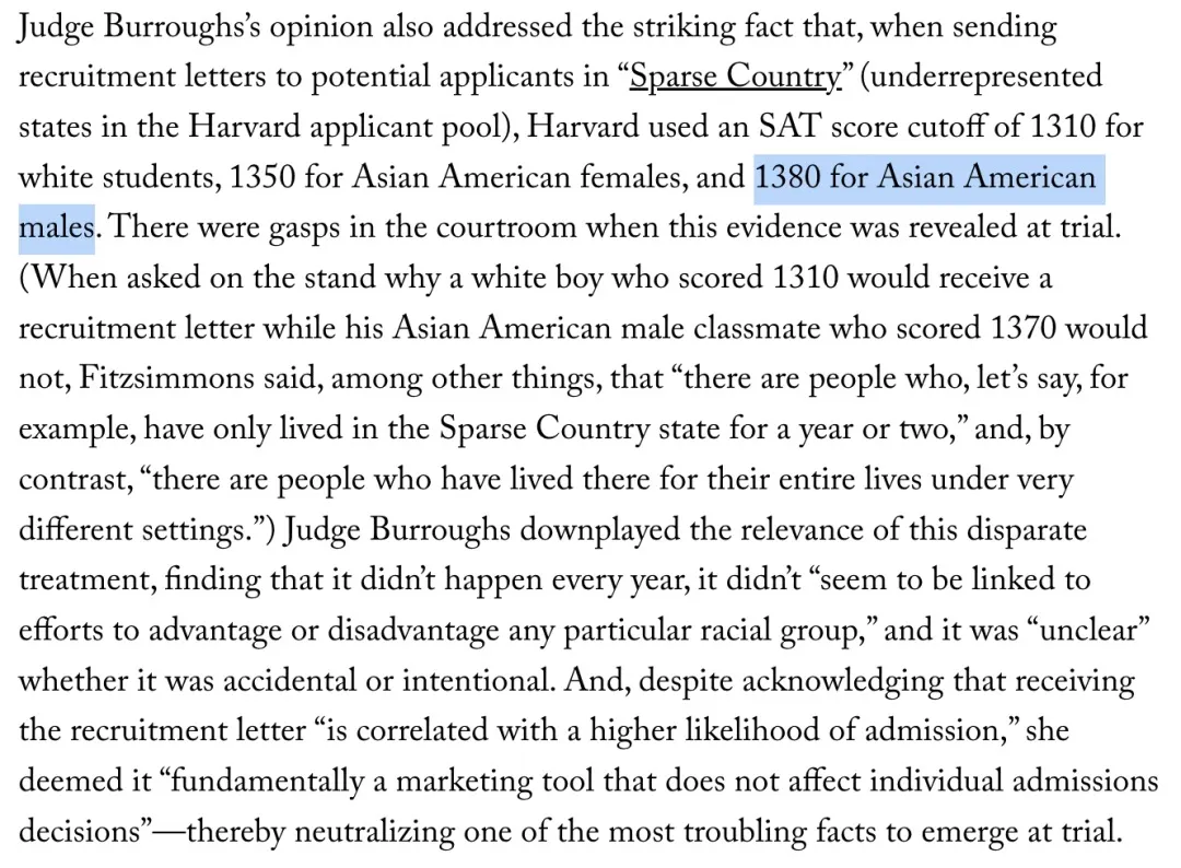 尽管证据如此明显,Burroughs法官依然试图淡化这种差别待遇,声称这种事情不常发生:“只是营销手段,不会影响录取结果。”