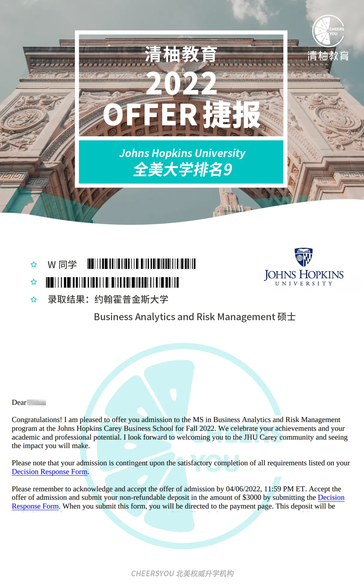 Z同学担任过多次金融峰会的志愿者,还经常和同学组队参加金融挑战赛,这些经历不断坚定了Z同学在这个领域深耕的想法。清柚老师根据Z同学的想法为他推荐了垂直于金融和BA方向进行申请。Z同学的本科经历十分丰富,但这也导致她在撰写文书时像记“流水账”。于是清柚为Z同学匹配了在金融和BA方向有着丰富经验的文书老师,和Z同学一起头脑风暴,反复打磨出了一篇精品文书。提交完所有材料后不久,Z同学就收到了JHU和南加州大学的橄榄枝。随后更是拿下了香港科技大学的“卷王”项目!