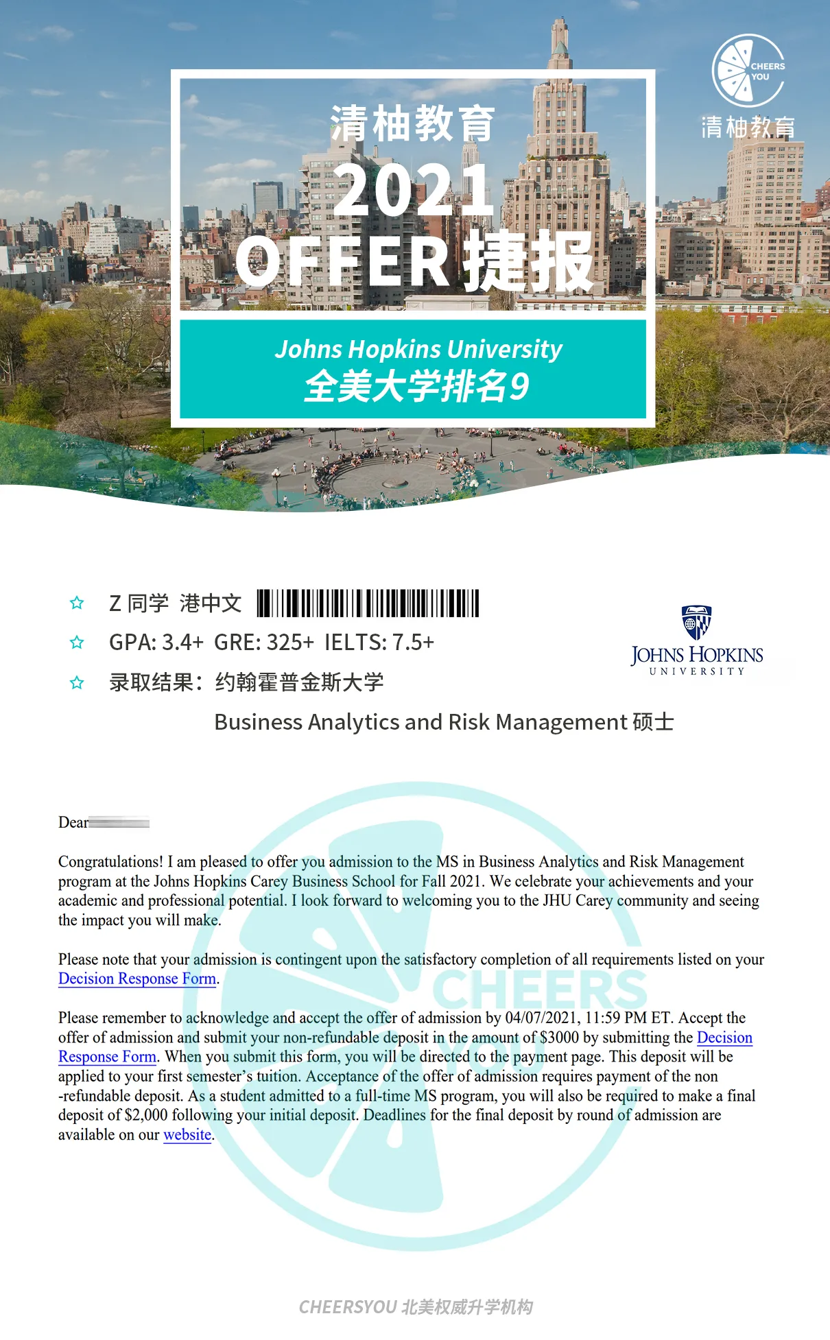 录取情况:约翰霍普金斯大学、香港科技大学、南加州大学等