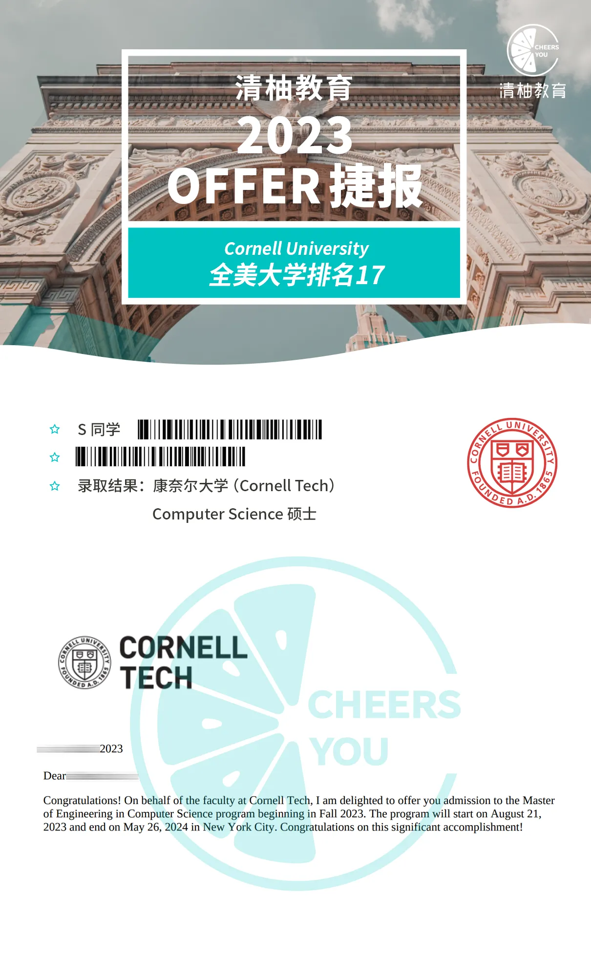 S同学在本科期间一直保持着优秀的成绩,也要想站上更好的平台得到更好的发展。美国CS行业收入水平普遍高于全球其他地区,还可以接触最顶尖的行业人才,因此S同学将目标定为CS项目。但S同学的本科院校并不强势,他担心自己目标太高被“全聚德”。清柚老师告诉S同学,大多数美国院校更看重的是申请者的成绩和与专业相关的经历,为了让S同学的优势更加明显,老师建议他参加了清柚的GRE课程,他也在短时间内就成功获得了330+的好成绩。S同学在专业上的优秀成绩和丰富经历让藤校对他青眼有加,最终不仅实现了非八大到藤校的逆袭,还被纽约大学和华大圣路易斯抢着要!