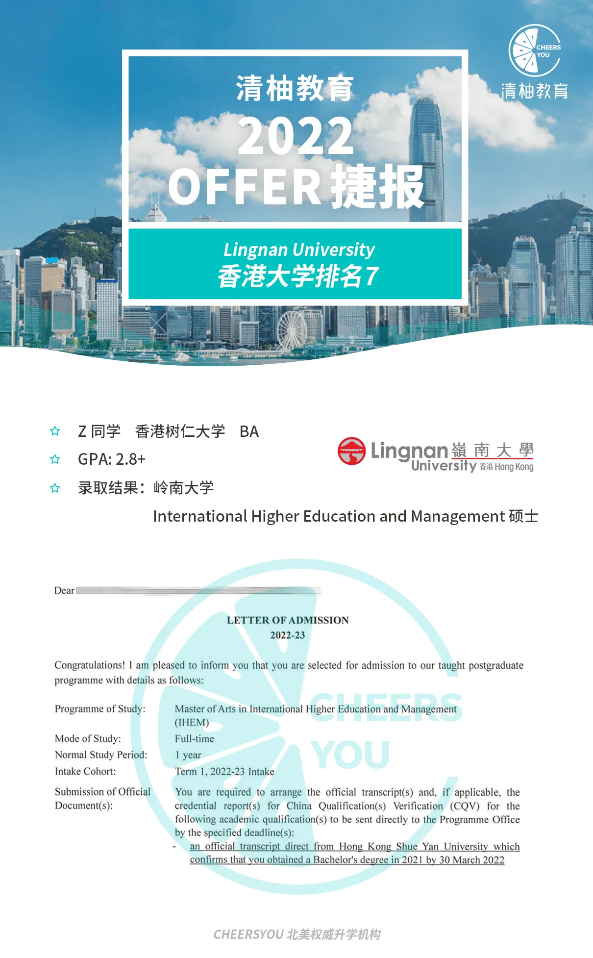 Z同学几乎有空就会参与教育相关的各种活动,她在这些活动中获得了深深的满足感和归属感,于是决心在未来也投身到教育事业中去。但Z同学的GPA不够理想,本科专业与教育也不相关,清柚老师告诉她这类专业非常喜欢对社会有爱有情怀的学生,一边为Z同学匹配了教育方向的精品实习,一边细心地辅导Z同学打磨文书,教她阐述自己转专业的原因及如何将自己对教育事业的热爱淋漓尽致地表达给招生官。不久之后,Z同学被香港岭南大双专业录取,香港教育大学的offer也接踵而至。