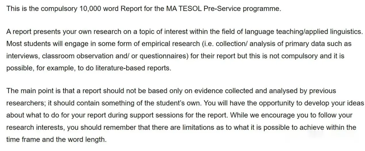 其中,Teaching English to Speakers of Other Languages (CCME0052)课程要求学生完成一篇10,000字的报告,以介绍他们对语言教学/应用语言学领域感兴趣的研究主题。