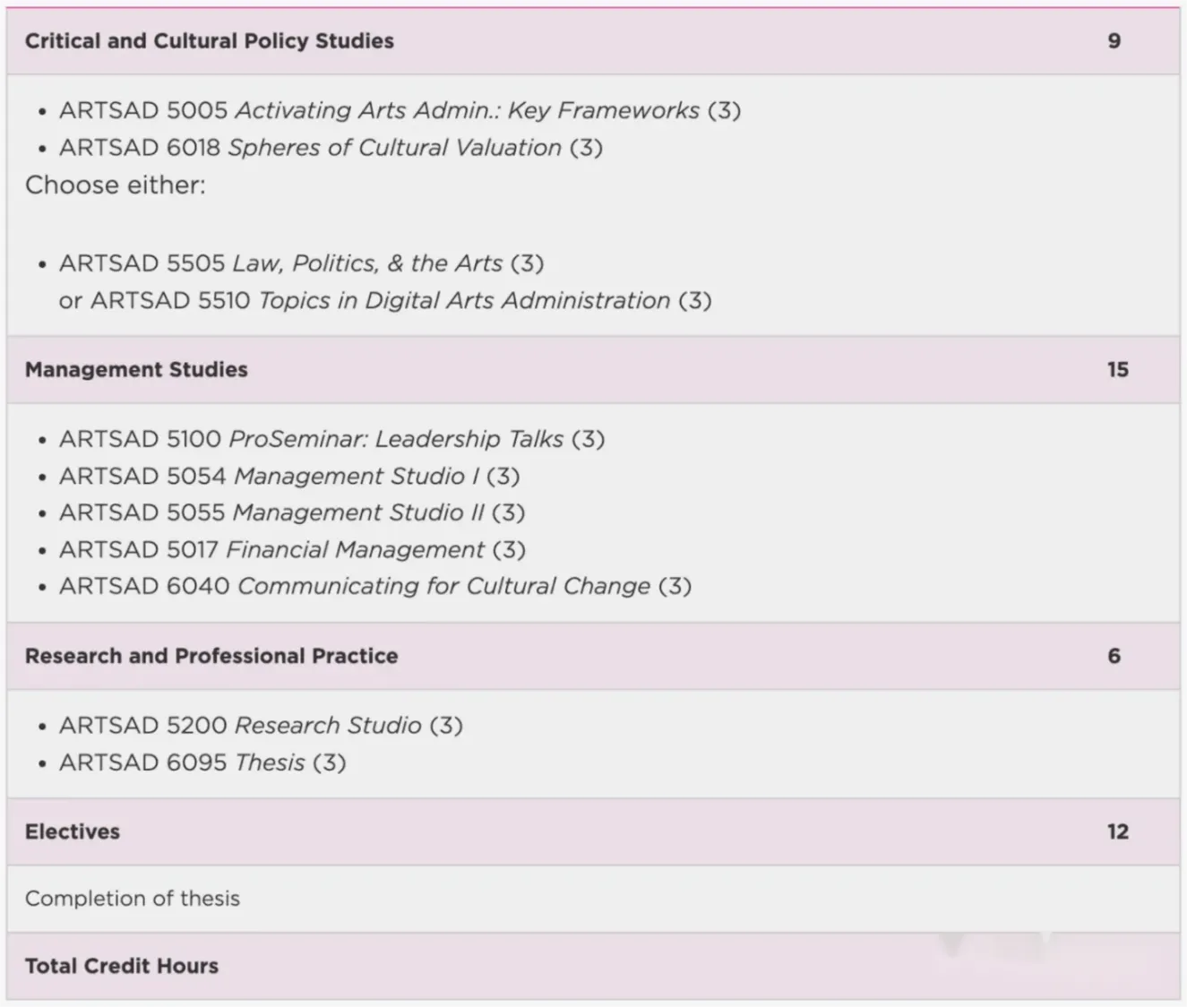该专业旨在培养学生对文化政策的理解和研究能力,并且提供与资金筹款相关的证书课程(Fundraising Management Certificate),以帮助学生在该领域获得专业知识。此外,学生可以根据自己的兴趣,在两个大的group中各选四门必修课程进行学习。