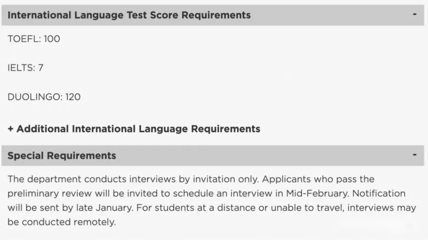 - 雅思(IELTS):最低总分为6.5,各部分的最低分数要求为:听力、阅读、写作和口语均为6.5。