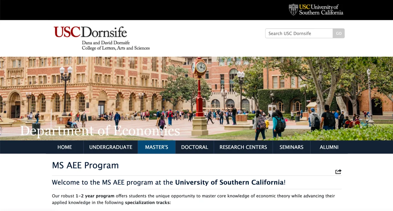 南加州大学的应用经济学与计量经济学硕士项目(Master of Science in Applied Economics and Econometrics)是提供经济学基本工具及其在实际问题中应用方面的高级培训,它为严格的美国博士经济学课程输送了很多人才,就读者在经济咨询和大数据分析领域,以及世界银行和国际货币基金组织等国际组织都能获得良好的职业发展。