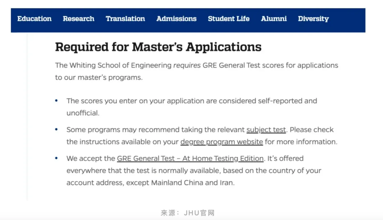 约翰霍普金斯大学的Whiting工程学院,所有专业均强制要求GRE成绩,同时也说明接受GRE家考。