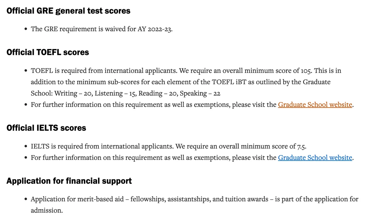 - 对于国际生,必须提交官方托福成绩(写作分数≥25;听力分数≥25;阅读分数≥25;口语 分数≥22)