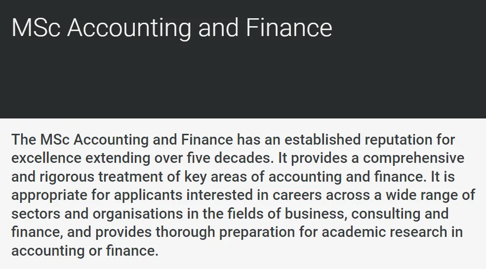 一般而言,Accounting、Organization and Institutions倾向于招收没有商科背景的学生,而Law and Accounting更倾向于录取本科读法律的学生。然而,对于那些在会计本科专业的同学们,不要感到迷茫,你们可以考虑朝会计学硕士(MSc Accounting)、金融学硕士(MSc Finance)或者管理方向发展。