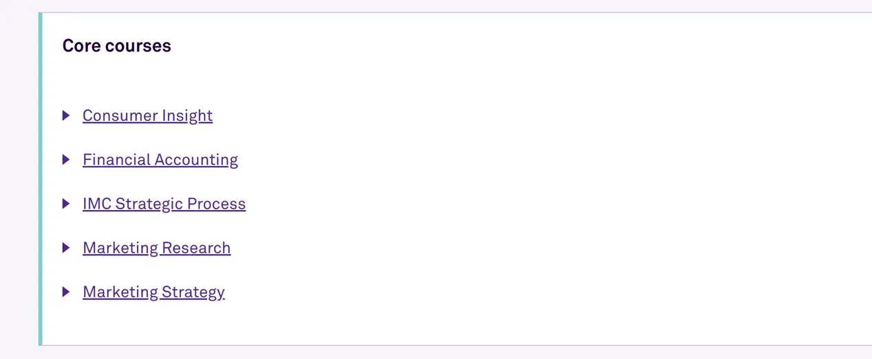 课程设置上,分为不同的sequence。学生在第一个quarter是学校给选好的核心课程,结束后可以选择1个或者多个sequence。4个sequence分别为brand strategy,strategic communication,media, consumer insights and analytics。另外第3个quarter为summer immersion quarter。项目会根据学生的长处以及个人偏好为学生分配合作公司展开10周的实习,表现好还有机会留用。