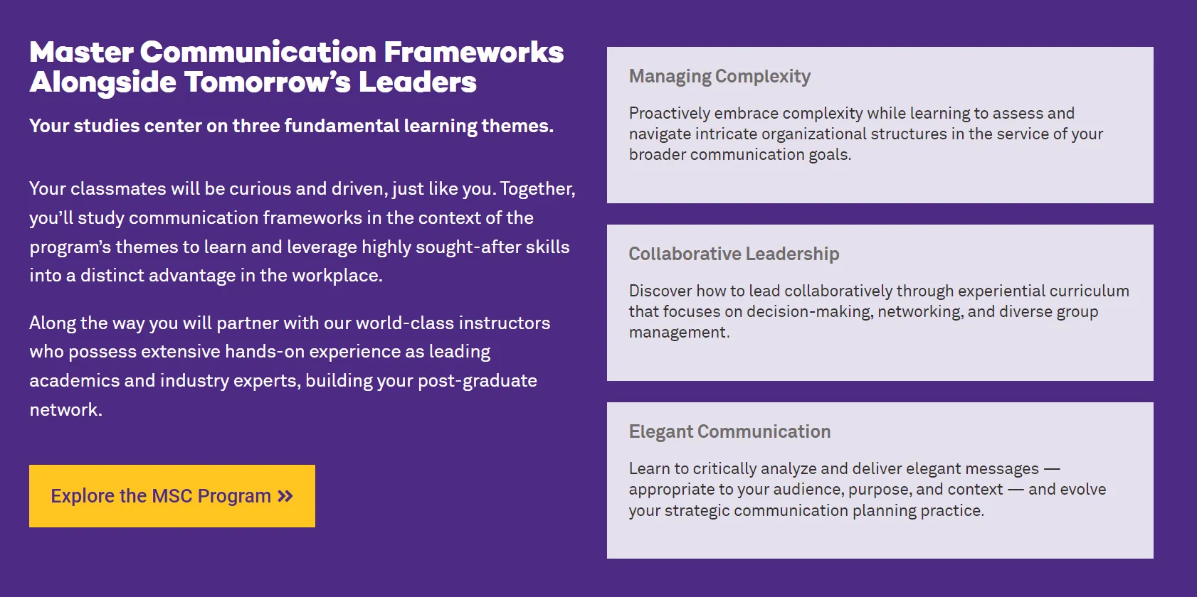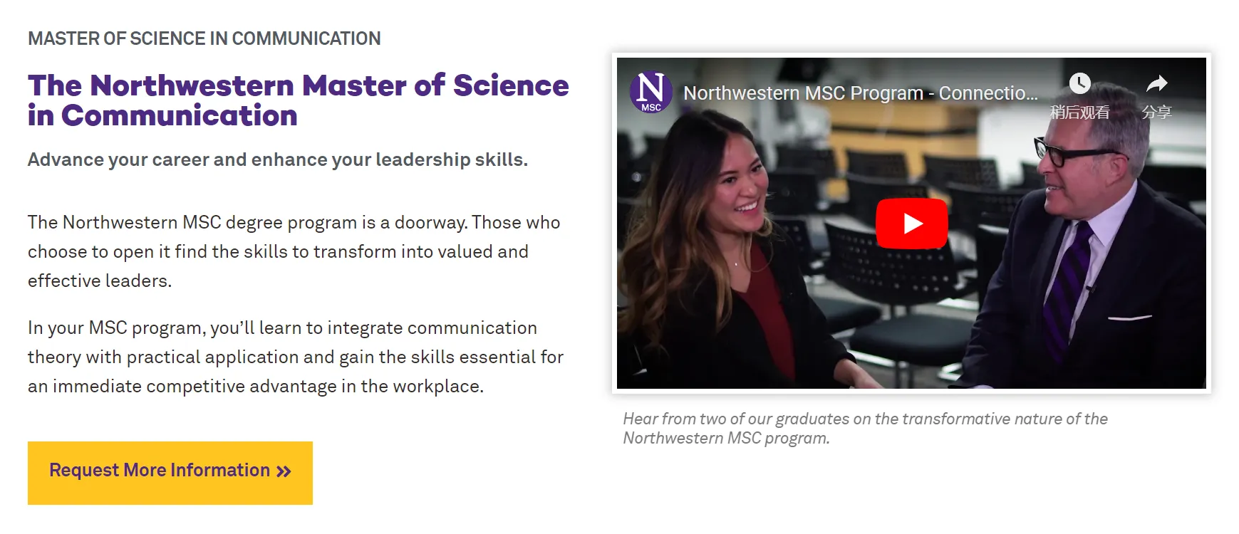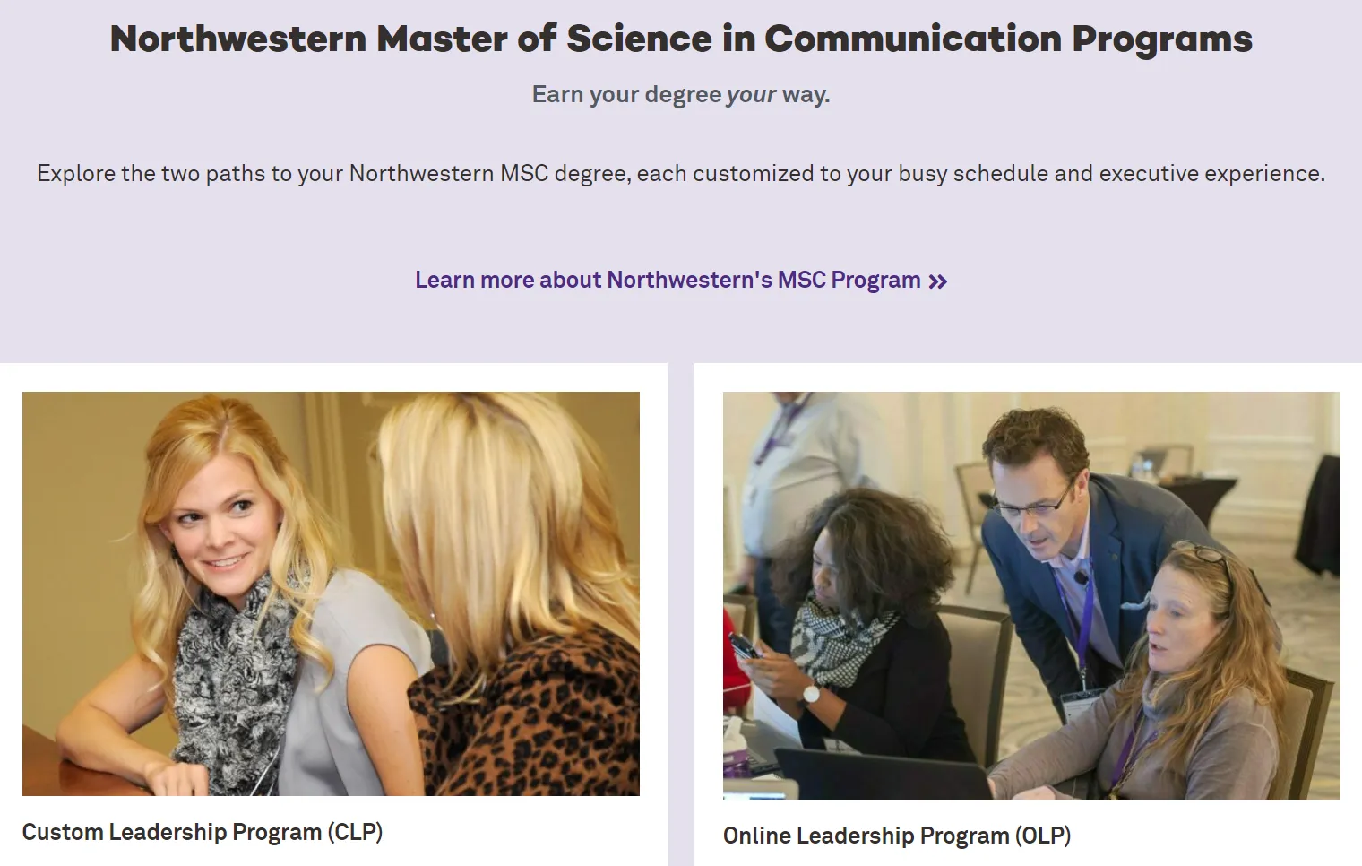 西北大学的传播学项目属于传媒学院(School of Communication),分为两种学习方式:Custom Leadership Program(1年,工作日+周末授课,适合国际学生)和在线课程