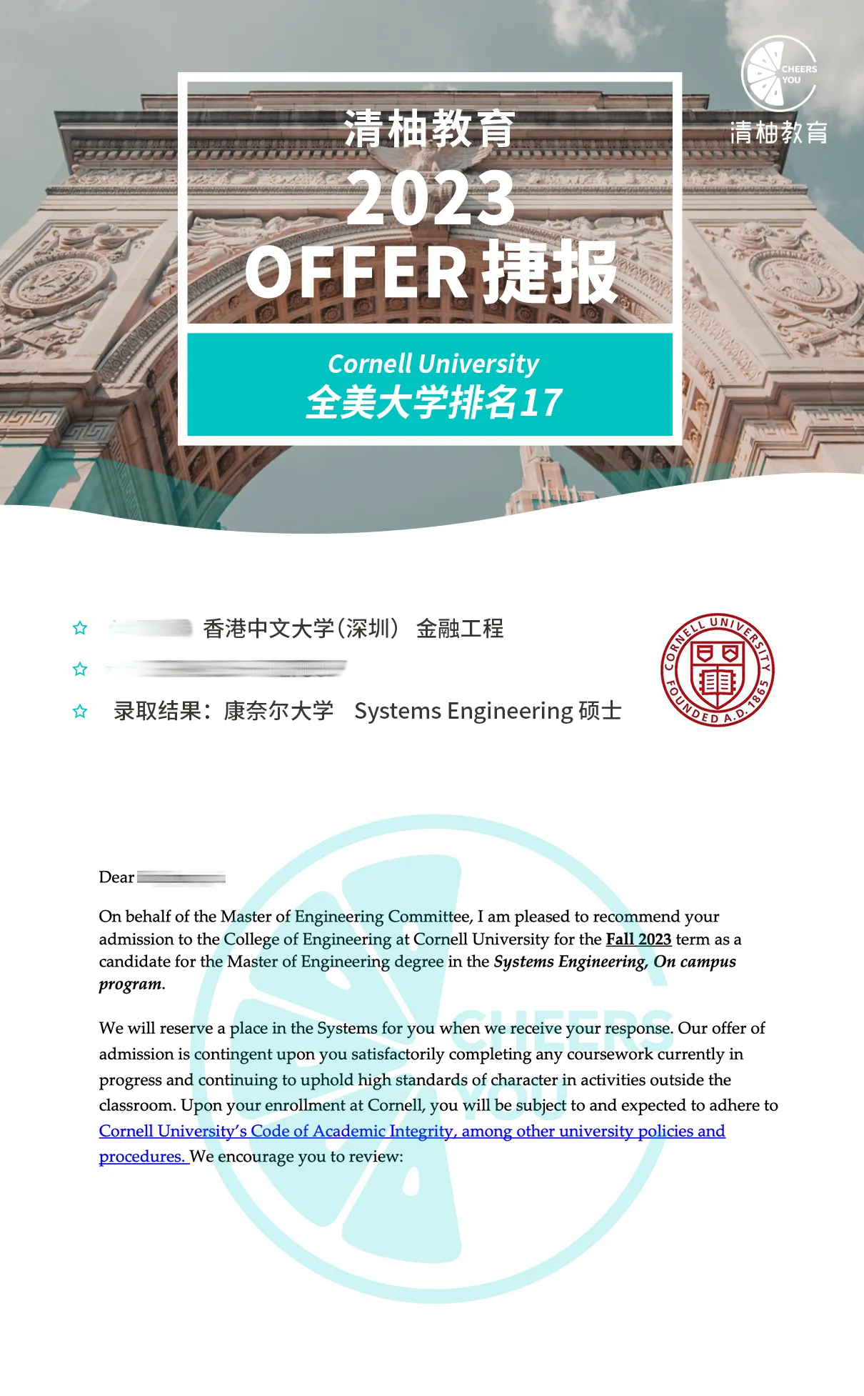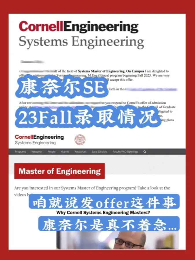 作为美国知名的工程学院之一,康奈尔大学在系统工程领域拥有卓越的研究和教学资源,涵盖广泛学科,如工程设计、优化、决策分析、系统模拟等。康奈尔系统工程的offer发放相对较晚,但录取率还是非常可观的,拒信主要集中在和系统工程不太匹配的申请者上。本文列举了一些23Fall的录取案例,24Fall的申请者可以参考一下下面的数据~更多问题可以添加清柚老师:qingyouge23获取详细信息!