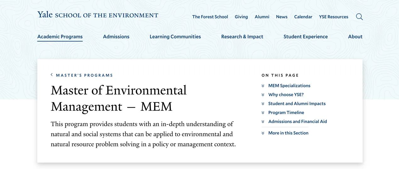 官网链接:https://environment.yale.edu/academics/masters/mem