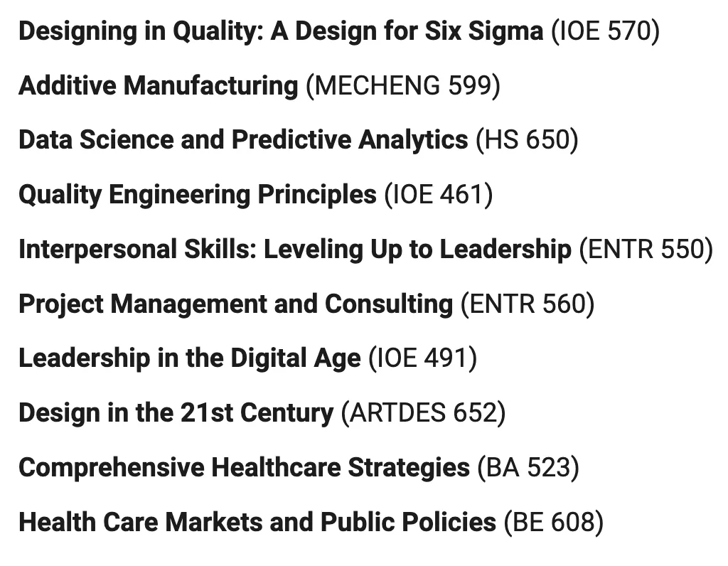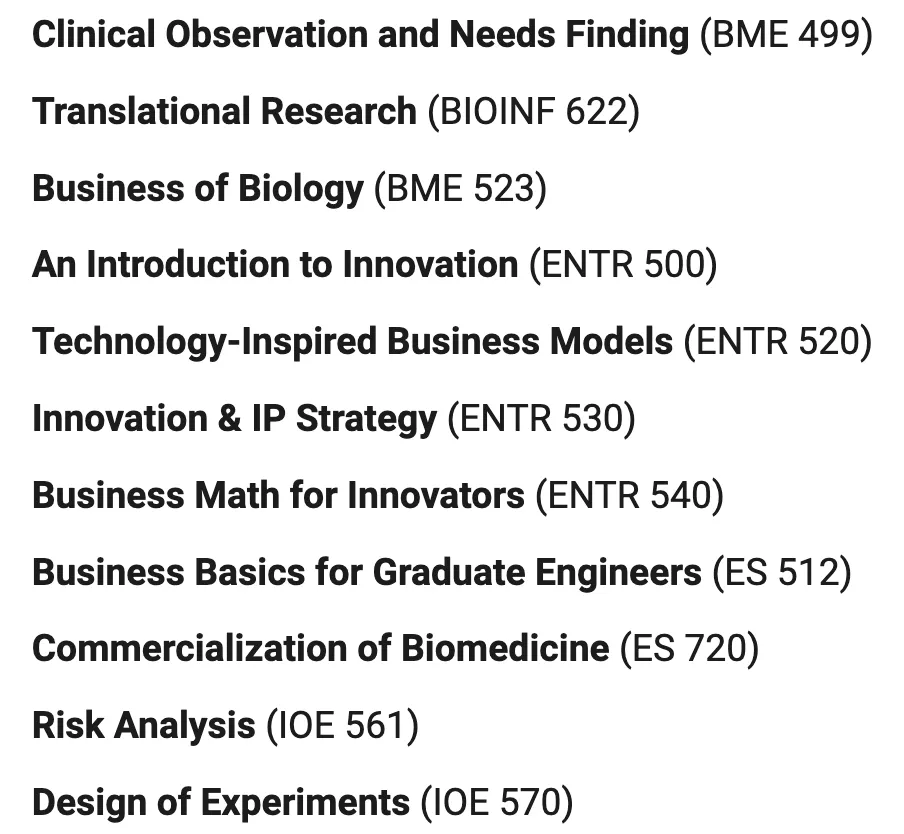 选修课程:下面提供的产品开发相关选修课的示例。*某些课程可能有先修课/教授批准的限制