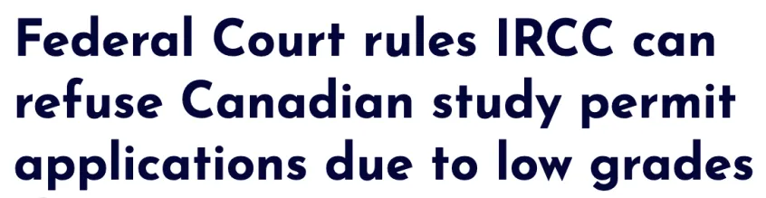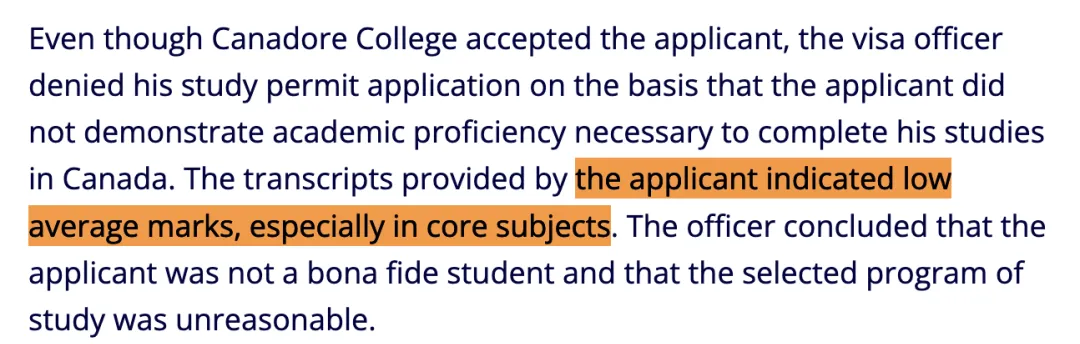 加拿大联邦法院官方表示:如果申请者之前所学的与加拿大申请项目相关的核心课程或核心科目成绩过低,即便学校录取了,签证官也有权利质疑申请者在加拿大完成学业的学术能力,拒绝给申请人发学签。