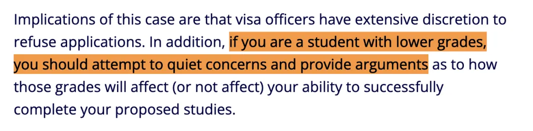 可以看出,加拿大签证官拥有拒绝申请的广泛自由裁量权(extensive discretion)。成绩较低的学生需要做出充分的解释来证明你有能力在加拿大完成学业,否则只有“死路一条”。