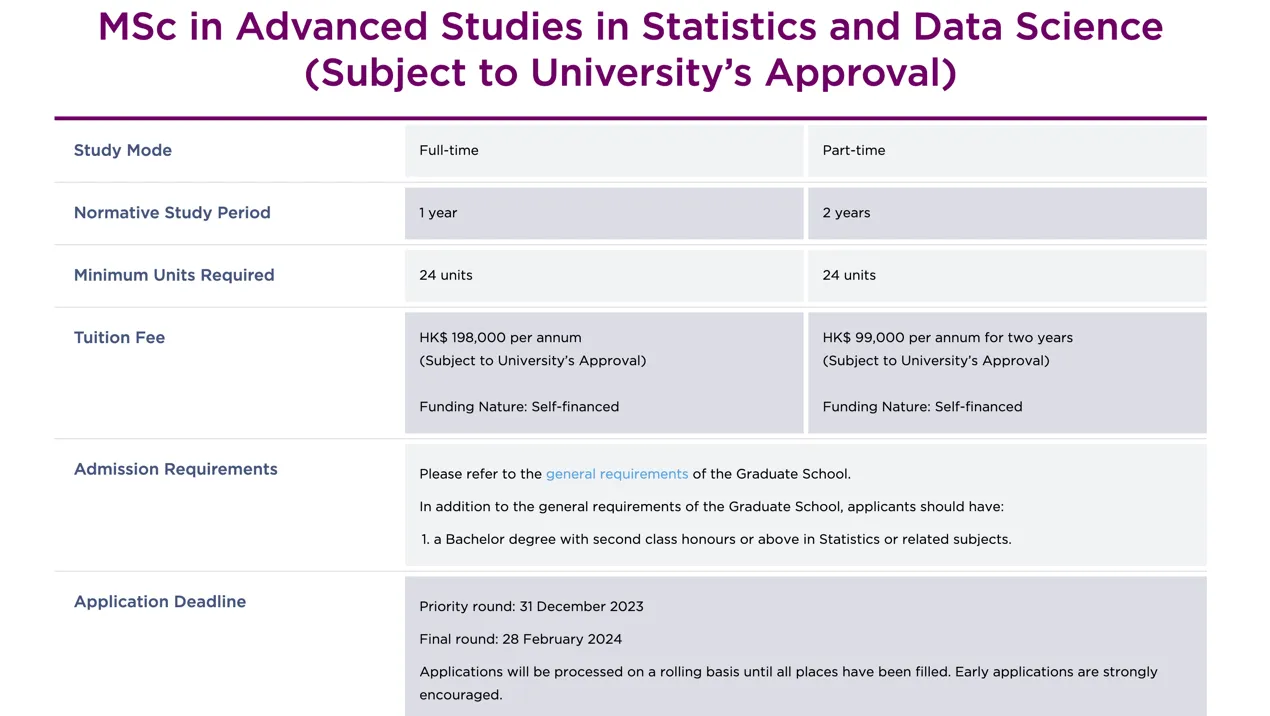 统计与数据科学高级研究硕士(MSc in Advanced Studies in Statistics and Data Science)开设在理学院统计系,结合了统计学、数学和计算机科学领域的知识,培养获得有意义的信息和做出商业决策的必要技能。是一个一年制全日制项目,学费为198000港币。