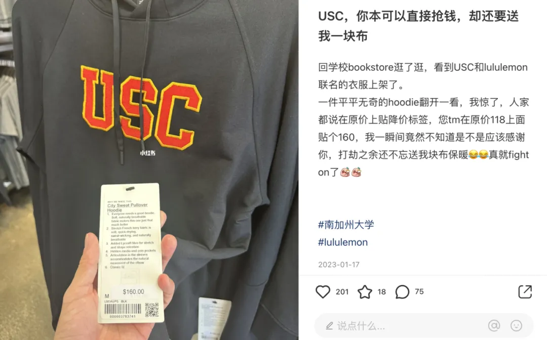 USC的联名款,118刀的标牌上直接贴了个160刀。校友表示:感谢学校在打劫之余还不忘送我块布保暖😅
