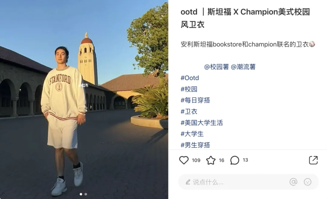 Champion和斯坦福的联名款,主打一个美式校园风OOTD。