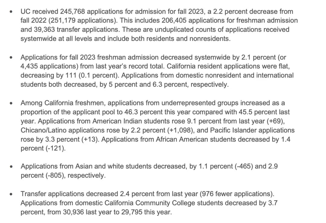 今年加州大学一共收到了245,768份申请,比去年的251,179份申请减少了约2.2%。