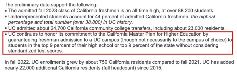 加州大学今年延续之前对加州高等教育主计划的承诺,在不考虑标准化考试成绩的情况下,保证高中前9%或者本州前9%的学生进入加州大学校园(尽管不一定是所选择的分校)。