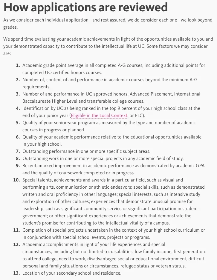 加州大学招生办在官网上明确写出,会根据13项标准来审核每一份申请,而不仅仅是去看学生的GPA。
