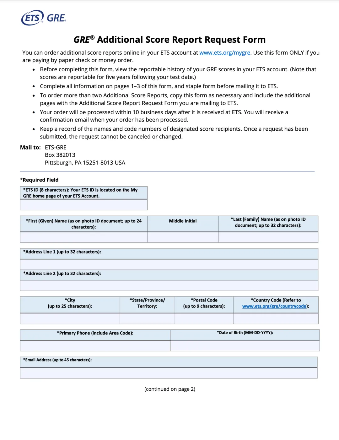 考生可以在官网下载一份成绩寄送申请表格,填写完成后将表格寄送或传真到ETS中心。