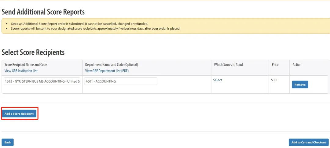 5. 增加送分学校。如果你想一次寄送多所学校,点击【Add Score Recipient】 ,继续增加,则重复本项操作。